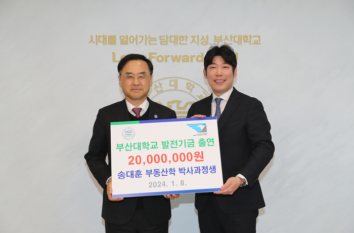 부산대학교(총장 차정인)는 경영대학 부동산학전공 송대훈(22학번, 41세) 박사과정생이 8일 오전 경영대학 지원을 위해 발전기금 2,000만 원을 출연했다고 밝혔다.