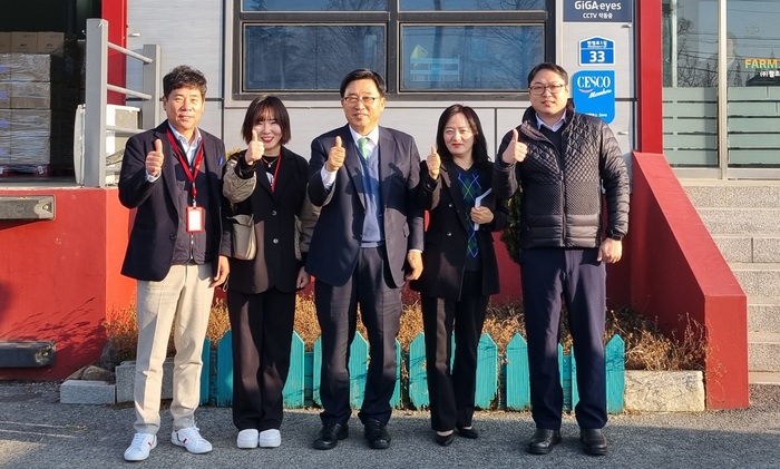 ▲ ㈜팜조아 농업회사법인 방문 현장 사진. 한국농수산식품유통공사 김춘진 사장(좌측 3번째), 황은경 ㈜팜조아 농업회사법인 대표(좌측 2번째). 사진=aT © 인디포커스