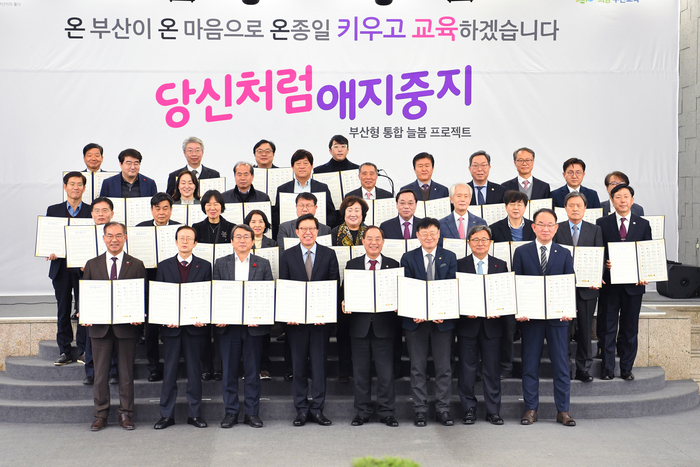 「온 부산이 온종일 당신처럼 애지중지」는 시와 교육청, 16개 구군, 지역대학이 함께 준비한 '온 부산'이 '온종일' '온 마음'을 다해 아이들을 키우고 교육하는 부산형 통합 늘봄 프로젝트로, 전국 최초의 부산형 돌봄 및 교육 정책 브랜드다.