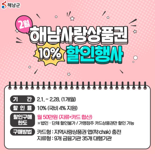 해남사랑상품권, 2월은 100만원 까지 10% 할인