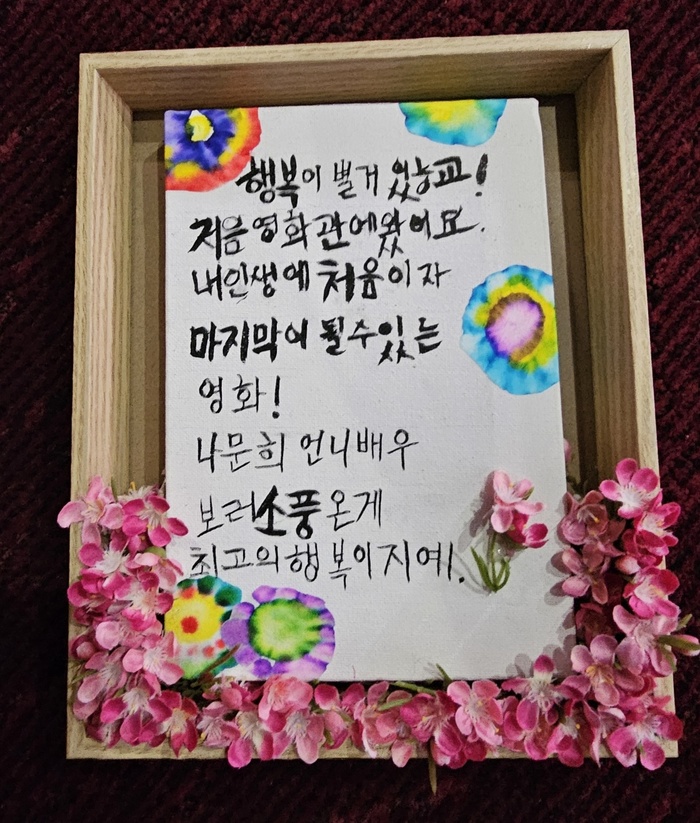 부산연탄은행에서는 시사회 초대에 감사한 의미를 담아 특별한 선물을 준비했다. 홀몸 어르신들이 손수 만든 캘리그래피 작품으로 한글을 몰라 서러운 세월을 살아오셨던 어르신들이 ‘훈민정음반’을 통해 한글을 배우고, 시를 캘리그래피로 손수 적어 완성한 선물이다.