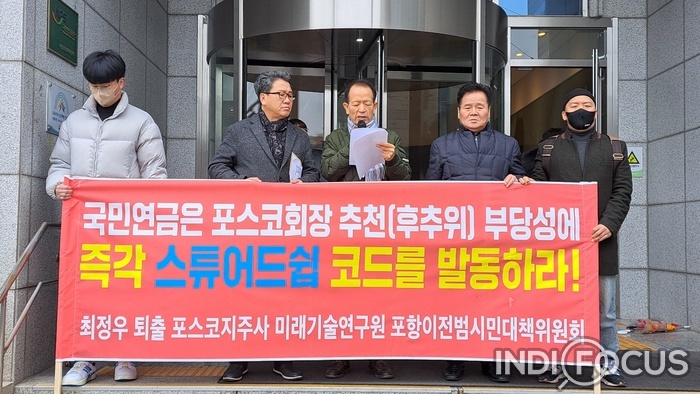 최정우 퇴출! 포스코지주사 본사 ㆍ미래기술연구원 포항이전 범시민대책위원회는 5일 오전 11시 서울 충정로 국민연금 사옥앞에서 "포스코홀딩스 CEO후보추천위원회의 결격 사유와 부당성에 국민연금공단이 즉각 개입해 바로잡아야 한다"고 요구하는 성명서를 발표했다.