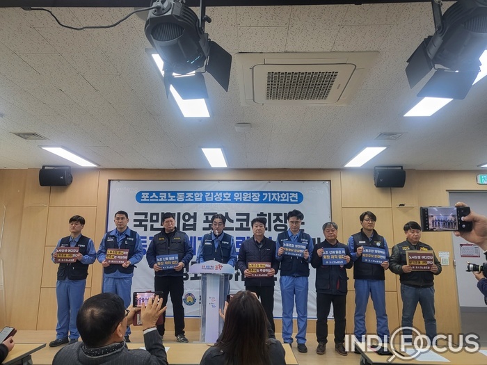 6일 포스코 김성호 노조위원장이 포항시청에서 기자회견을 하고 있다. 사진/김익태© 인디포커스
