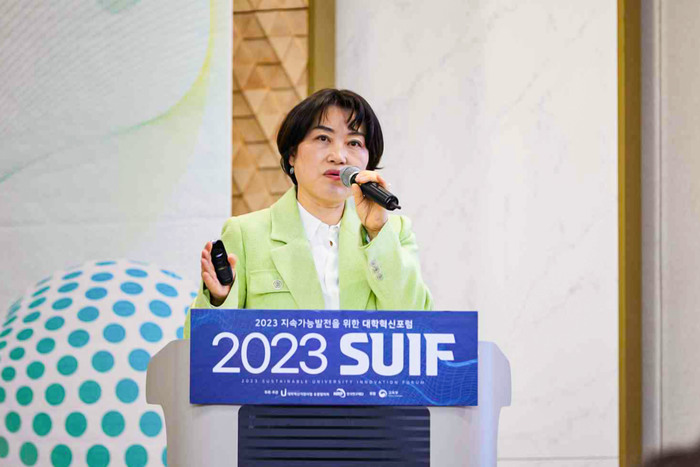 ▲ 와이즈유 영산대학교 김수연 부총장이 최근 열린 '2023 지속가능 발전을 위한 대학혁신포럼'에 참가한 모습. /영산대 © 김중건