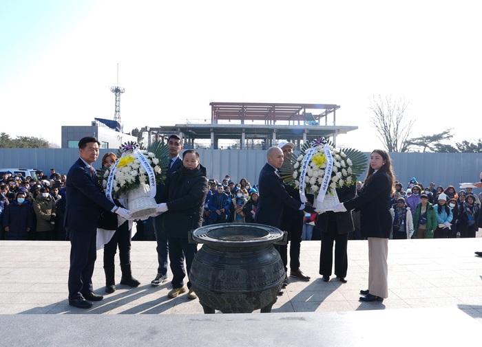 ▲ 2024 피스로드 통일대장정 세계출정식에서 대표자들이 헌화하고있다. © 김중건