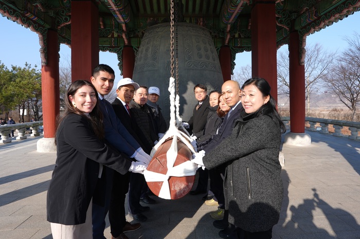 ▲ 2024 피스로드 통일대장정 세계출정식에서 평화의 종 타종하는 참석자들 © 김중건