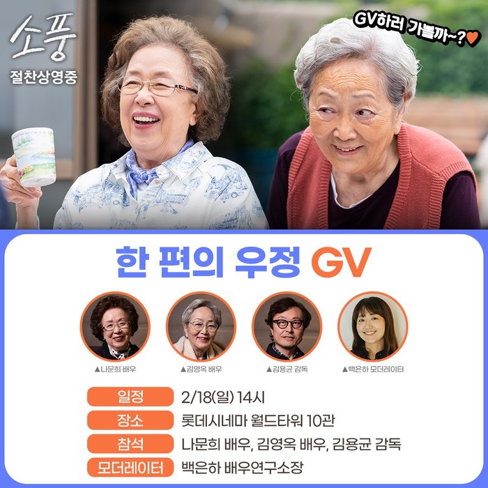영화 <소풍> ‘한 편의 우정 GV’ with 나문희, 김영옥 2월 18일(일) 14시 롯데시네마 월드타워개봉 이후 최초 관객들과 특별한 만남! 나문희 X 김영옥의 찐 우정이 관객들의 ‘찐 공감’ 이끌어영화 <소풍>이 나문희, 김영옥 배우와 김용균 감독이 함께하는 스페셜 GV를 개최한다. “영화 내내 가슴 먹먹, 앞으로의 나의 이야기가 될 수도. 배우님들의 진솔한 삶의 연기 플러스 임영웅의 감미로운 목소리가 더해져 더 실감” 난다는 관객들의 뜨거운 반응에 힘입은 흥행 순항에 보답하고자 행사 자리를 마련했다.
