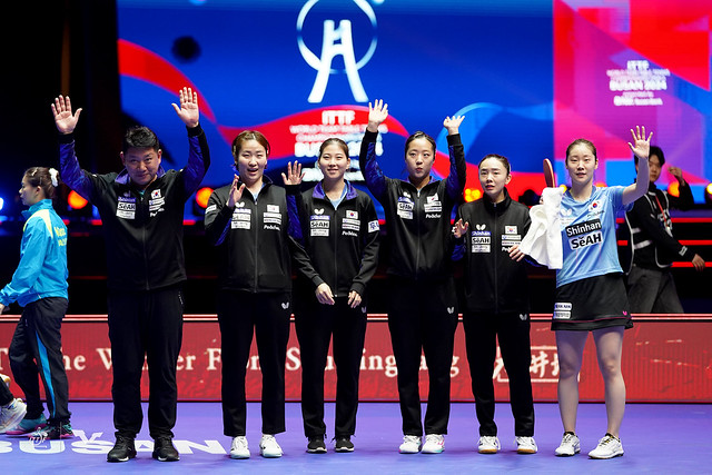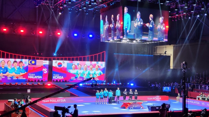 ▲ 2024부산세계탁구선수권대회 개막식 후 이어진 여자단체전에 출전한 한국 탁구 여자팀과 말레이 탁구 여자팀 ©김중건