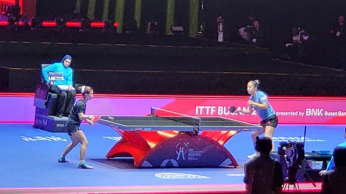 ▲ 2024부산세계탁구선수권대회 개막식 후 한국탁구 여자팀 신유빈 선수가 밀레이 탁구 여자팀 선수와 경기를 펼치고 있다 © 김중건
