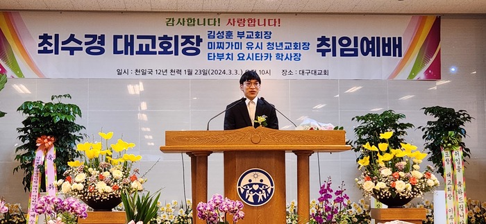 김성훈 부교회장도 취임사에서 “부족한 저를 대구대교회 부교장으로 임명해 주셔서 책임감에 어깨가 무거워지는 것 같다”라며 “이렇게 대구로 오게 된 것은 하늘 부모님께서 저에게 새로운 임지에서 경험과 성장을 바라실 내용이 있기 때문일 것이다”라고 말했다.