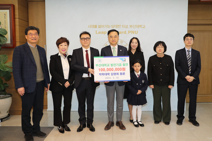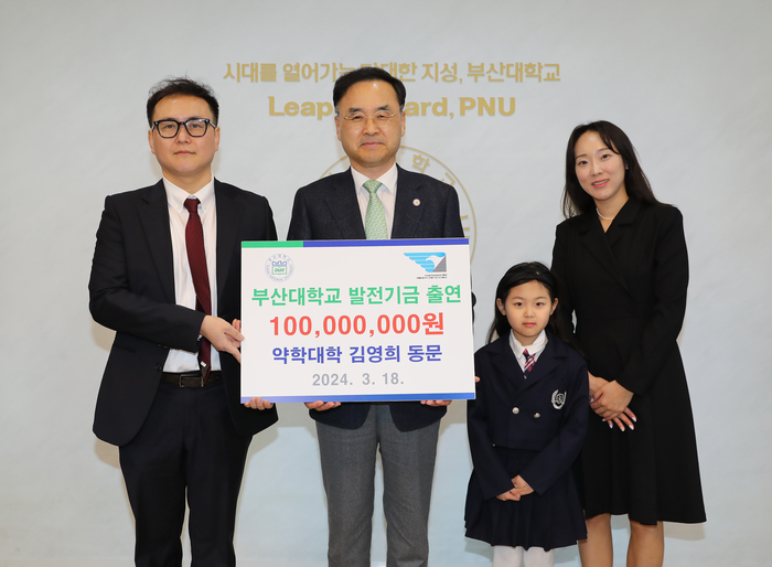 부산대학교(총장 차정인)는 약학대학 김영희(73세) 동문이 모교의 약학대학 지원을 위해 1억 원의 발전기금을 출연했다고 19일 밝혔다. 18일 오후 교내 대학본부 5층 총장실에서 진행된 발전기금 출연식에는 거동이 불편한 김영희 동문을 대신해 아들과 며느리, 손녀 등 가족들이 대신 참석했다.