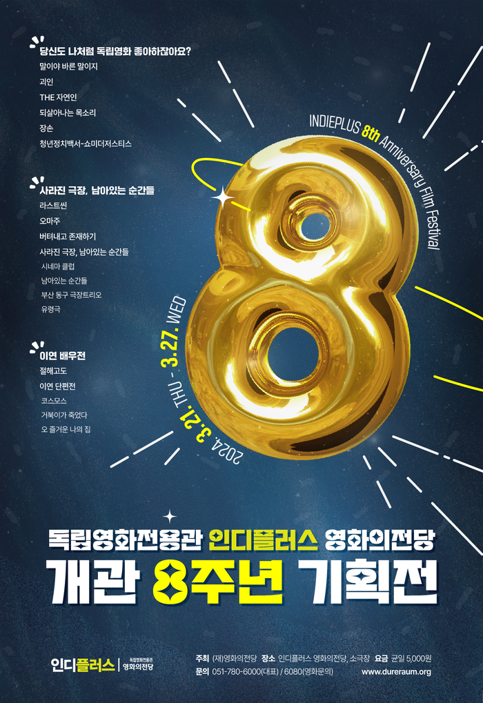 인디플러스 영화의전당 ‘개관 8주년 기획전’은 2024년 3월 21일(목)부터 3월 27일(수)까지 일주일간 상영되며, 관람료는 균일 5,000원이다. 개관 8주년을 맞아 관객을 위한 특별한 이벤트도 준비되어 있다.
