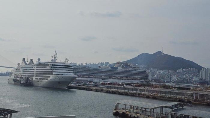 ▲ 과거 부산항에 동시 기항한 크루즈 2척(다이아몬드 프린세스와 세븐시즈 익스프로러/부산항만공사 © 김중건