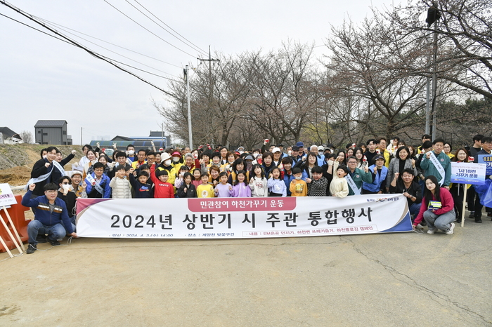 김포시에서 봄을 맞아 깨끗한 하천을 만들기 위해 시민·공무원 약 150여명이 참석한 가운데 ‘2024년 상반기 민관참여 하천가꾸기 시 주관 통합행사’를 지난 3일 오후 2시 ‘계양천 벚꽃구간’ 일대에서 실시했다.