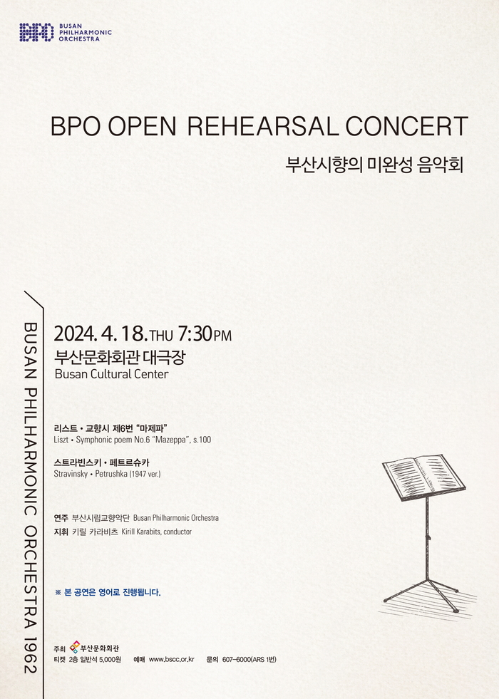 부산시립교향악단의 시그니처 프로그램인 오픈 리허설 형식의 부산시향의 미완성 음악회Ⅰ에서는 제610회 정기연주회에서 연주될 리스트의 교향시 제6번 <마제파>와 스트라빈스키의 <페트르슈카> 1947년 버전의 생생한 연습 과정을 관객들에게 소개한다. 특히 통역 없이 진행되는 음악회에서는 외국인 지휘자와 연주단원들이 영어로 소통하면서 음악을 만들어 가는 모습을 관객들에게 여과 없이 전할 예정이다.