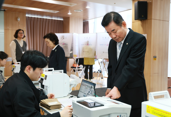 ▲ 김진표 국회의장이 5일 오전 여의동주민센터 사전투표소에서 투표에 참여하고 있다. 사진=국회사무처 © 인디포커스