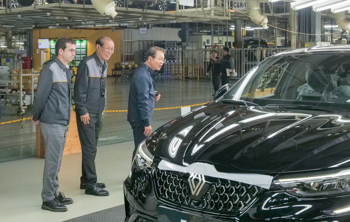 ▲ 좌측부터)스테판 드블레즈 르노코리아 사장, 이해진 르노코리아 제조본부장, 이정식 고용노동부 장관이 르노코리아의 부산공장을 둘러보고 있다 © 김중건