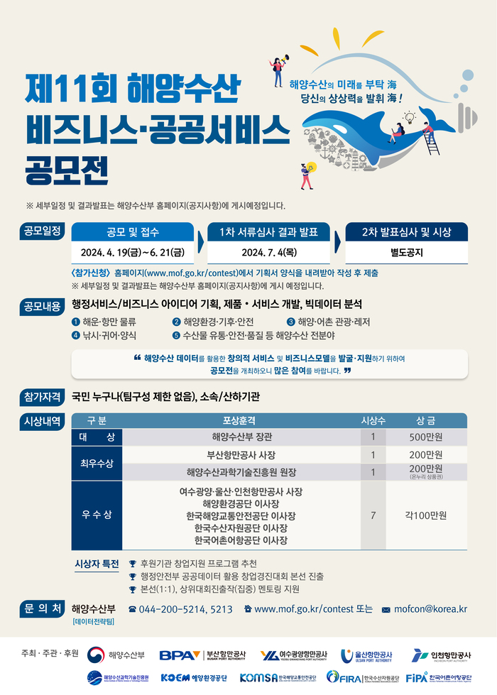 부산항만공사(BPA, 사장 강준석)는 해양수산부 등과 공동으로 ‘제 11회 해양수산 비즈니스 ․ 공공서비스 공모전’을 4월 19일부터 6월 21일까지 개최한다고 밝혔다.