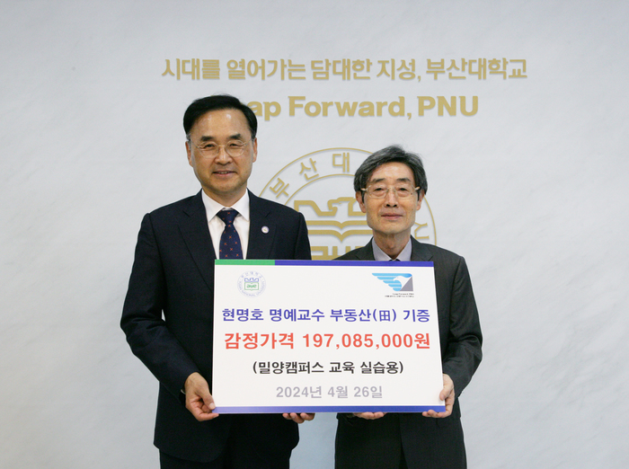 부산대학교(총장 차정인)는 화학과 현명호 명예교수(73세)가 밀양시 단장면에 소재한 1억 9,700만 원 상당의 부동산 밭(田) 1,855㎡를 부산대 밀양캠퍼스 재학생을 위한 교육 실습용으로 26일 기부했다고 밝혔다.