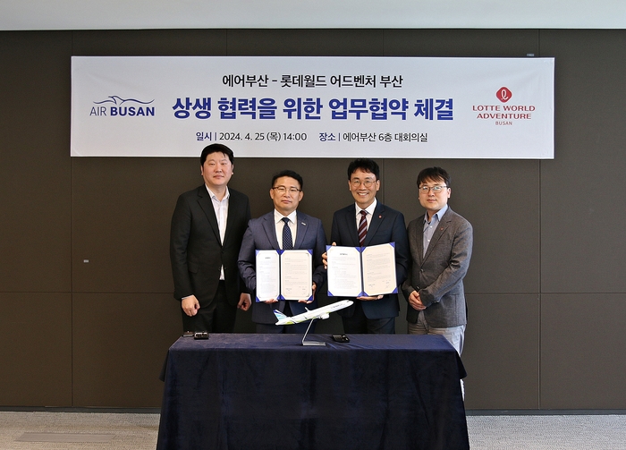 에어부산은 지난 25일 오후 부산 강서구 소재 에어부산 사옥에서 롯데월드 어드벤처 부산과 업무협약을 체결했다. 협약식에는 에어부산 마호진 영업본부장과 롯데월드 김관식 영남영업부문장을 비롯한 양사 관계자들이 참석했다.
