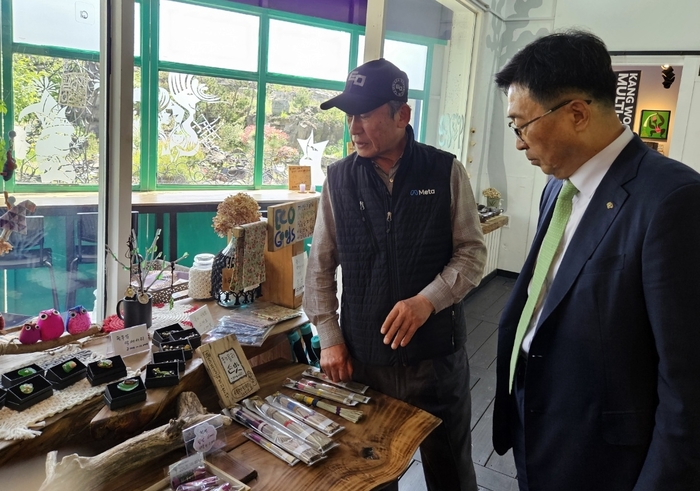 ▲ 탐나라공화국 현장 방문사진. 한국농수산식품유통공사 김춘진 사장(우측), 탐나라공화국 강우현 대표(좌측) © 인디포커스