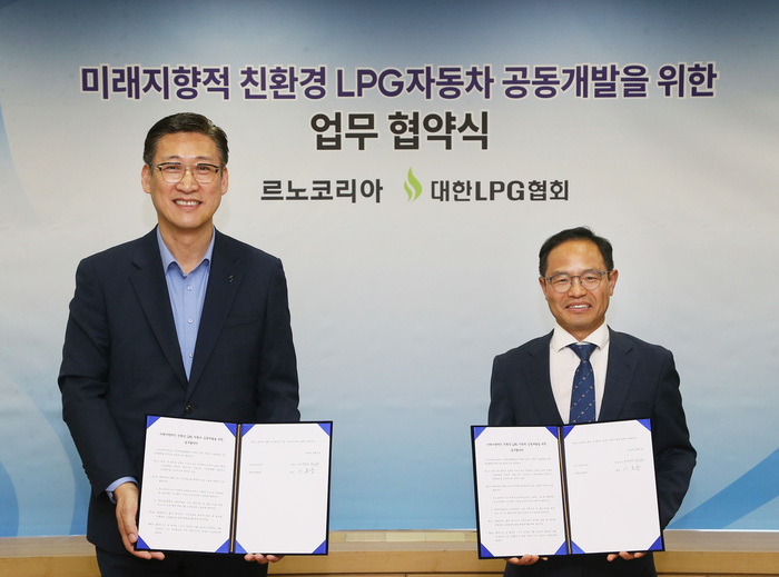 ▲ (좌측부터) 최성규 르노코리아 연구소장과 이호중 대한LPG협회장이 '차세대 친환경 LPG 차량' 공동개발 업무협약을 체결하고 있다_/르노코리아 © 김중건