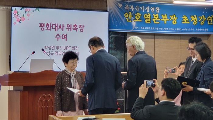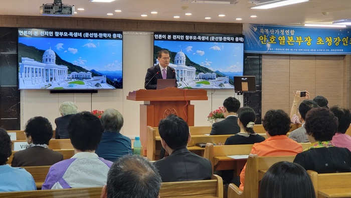 북부산가정교회, 안호열 세계평화통일가정연합 대외본부장 초청 강연회 성료5일, ‘언론이 본 천지인참부모, 문선명·초림 독생녀 한학자 총재’ 주제로 강연 미래세대 어린이날 선물 건네고 축복, 평화대사 위촉도세계평화통일가정연합 북부산가정교회(교회장(교회장 이남경)는 5일 오전 10시 부산시 사상구 사상로 469번길 1 북부산가정교회 2층 대성전에서 안호열 세계평화통일가정연합 통일그룹 대외협력본부장을 초청, ‘언론이 본 천지인 참부모 독생녀(문선명·한학자 총재)’를 주제로 강연회를 개최했다.