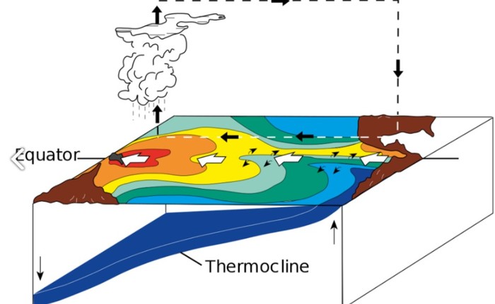 엘니뇨/남방진동(ENSO)는 지구 자전으로 인해 적도 부근 태평양에는 동쪽에서 서쪽으로 무역풍이 분다. 이 무역풍 때문에 일반적으로 동태평양 해수면은 서태평양보다 온도가 낮다. 태양에 더 많이 노출되어 해수면 온도가 높은 동태평양 해수가 무역풍 때문에 서쪽으로 움직이면 바다 밑의 차가운 물이 동태평양의 빈자리를 채우기 때문이다.
