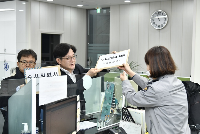 ▲ 김병수 김포시장이 직접 악성민원인 수사의뢰서를 제출하고 있다. 사진=김포시청 © 인디포커스