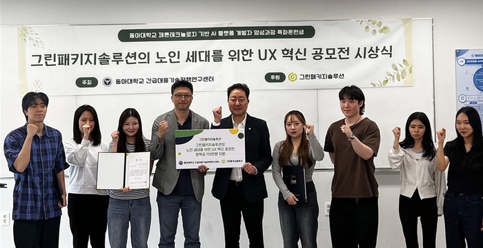 동아대 긴급대응기술정책연구센터와 ㈜그린패키지솔루션관이 공동으로 진행한 ‘노인 세대를 위한 UX 혁신 공모전’은 ‘제론테크놀로지 기반 AI 플랫폼 개발자 양성 과정’ 특화훈련생을 대상 지역 청년들의 사회문제 해결 능력을 키우기 위해 마련됐다.