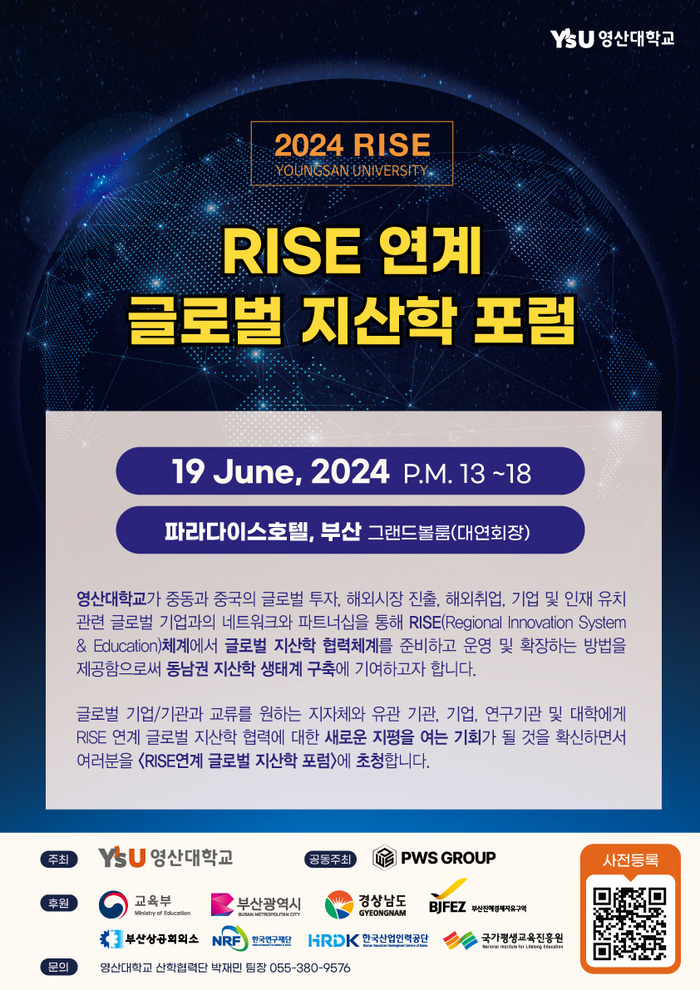 ‘RISE연계 글로벌 지·산·학 포럼’은 지자체와 글로벌 기업 및 기관 관계자가 대거 참석하고, 글로벌 투자, 해외시장 진출, 해외취업, 기업 및 인재유치 등 향후 글로벌 기업 및 기관과의 네트워크와 파트너십 역할은 영산대가 주요 통로가 될 예정이다. 지자체에서는 박형준 부산시장, 상공계에서는 신정택 세운철강 회장, 언론계에서는 KNN 이오상 대표 등 부산을 대표하는 오피니언 리더들이 대거 함께 한다.