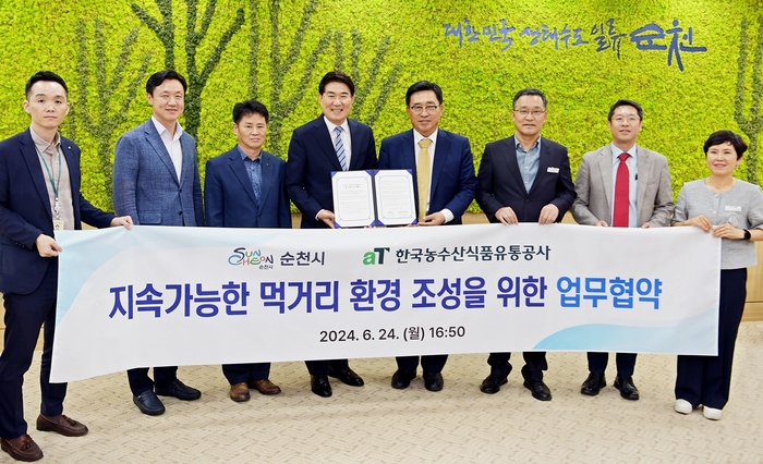 한국농수산식품유통공사(사장 김춘진)는 24일 순천시청에서 순천시(시장 노관규)와 함께 K-푸드 수출 확대와 저탄소 식생활 확산을 위한 업무협약을 체결했다고 25일 밝혔다.