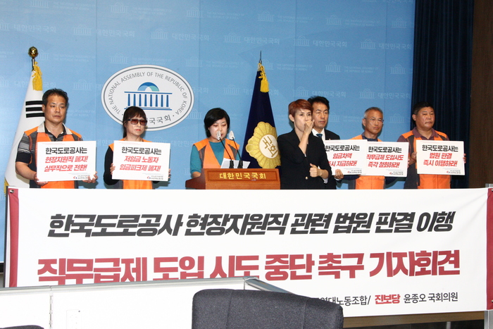 진보당 윤종호 의원과 민주노총 민주일반연맹 공공연대 노동조합은 2024년 7월 5일 오후 국회 소통관에서 기자회견을 열고 “한국도로공사는 법원 판결 즉시 이행하고 직무급제 도입 시도 중단하라!”고 촉구했다.