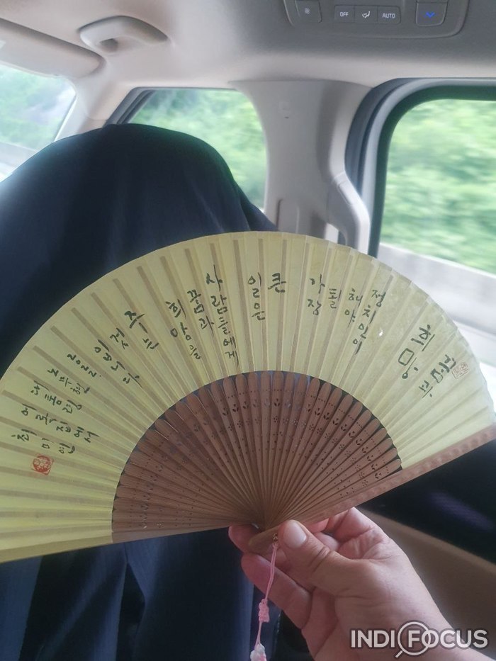 권 여사는 예방한 김두관 후보에게 노무현 대통령 어록 중에서 정치인이 새겨야 할 어록이 담긴 부채를 선물했다.