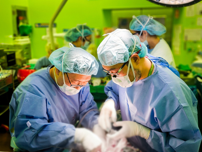 ▲ (왼쪽부터) 양산부산대병원 간이식팀(외과) 류제호 교수, 양광호 교수가 생체간이식을 집도하는 모습 © 김중건