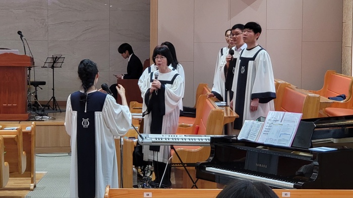 간중 목회는 부산대교회 성가대의 효정찬양과 ' 결단 찬송으로 할수있다 하신이' 를 다함께 합창했다.