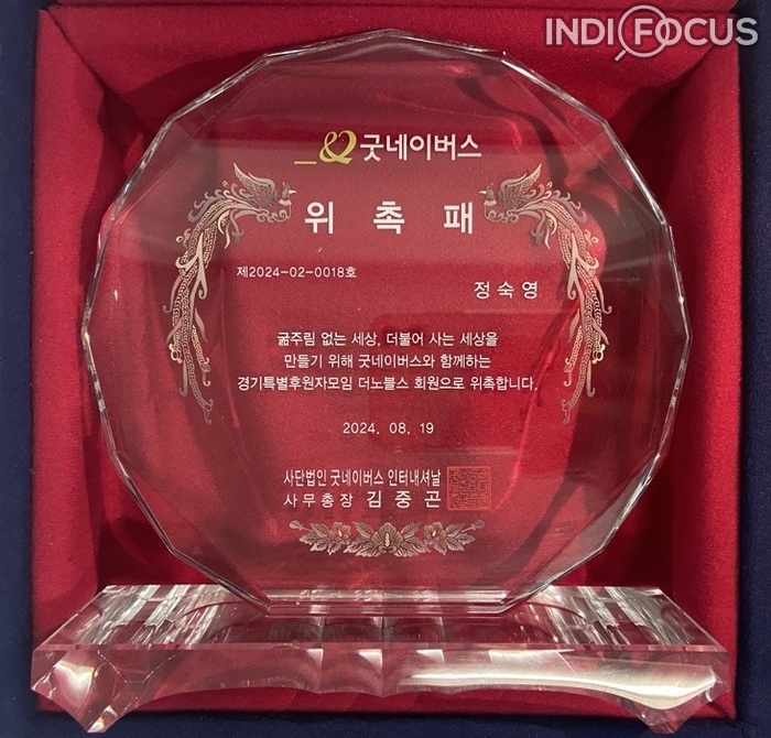 ▲ 정숙영 회원이 받은 경기특별후원자모임 더노블스 위촉패 모습 © 인디포커스