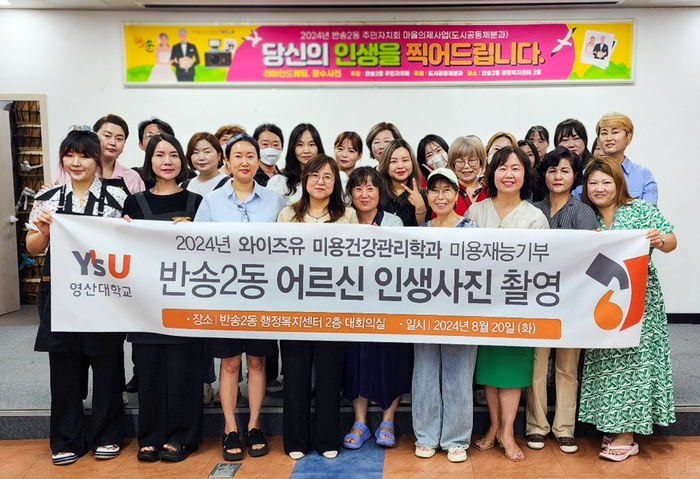 와이즈유 영산대학교(총장 부구욱) 미래융합대학 미용건강관리학과 교수와 학생, 동문 등 25명이 부산 해운대구 반송2동 어르신들 50여명의 인생사진을 위해 발 벗고 나섰다.