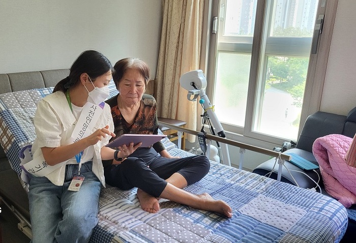 ▲ 양산부산대병원 연명의료상담실 간호사가 경로당을 찾아 연명의료결정제도에 대해 1:1로 설명하는 장면 © 김중건