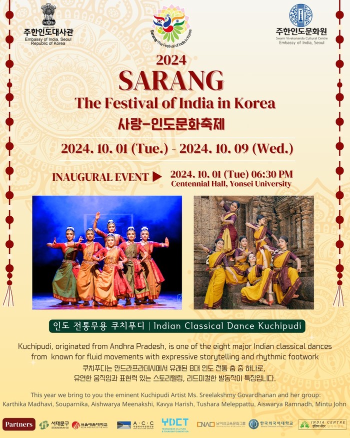 올해 사랑-인도문화축제에서는 인도 고전무용 ‘쿠치푸디(Kuchipudi)’ 공연이 10월 1일부터 9일까지 서울, 경기, 광주, 영덕, 춘천, 부산에서 펼쳐질 예정이다.