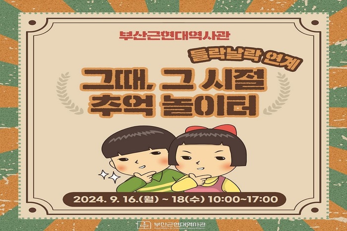 부산근현대역사관(이하 역사관)은 추석 연휴를 맞아, 오는 16일부터 18일까지 역사관의 어린이체험실 들락날락과 연계한 추석 프로그램 <그때 그 시절, 추억놀이터>를 운영한다고 밝혔다.
