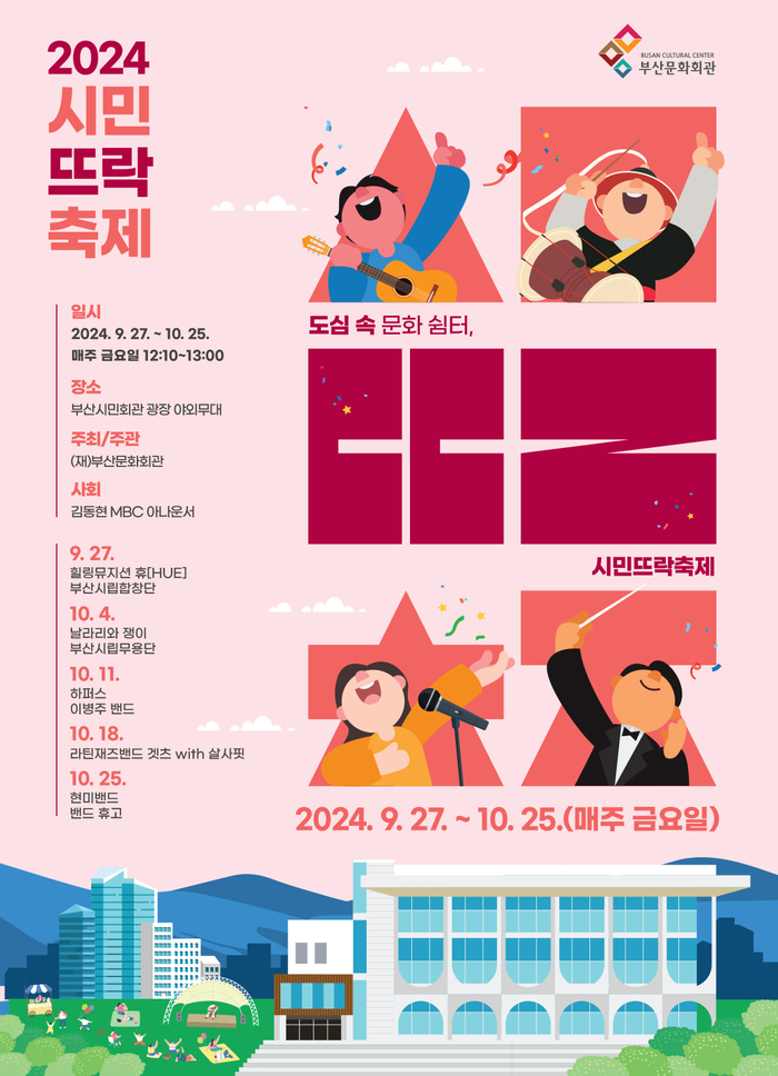 (재)부산문화회관 기획공연 <2024 하반기 시민뜨락축제> 9월27일~10월25일 매주 금요일, 부산시민회관 야외광장상반기에 이어 9월 27일부터 5주간 매주 금요일 부산시민회관 야외광장에서 개최, 2017년부터 마련된 도심 속 문화 쉼터 <시민뜨락축제>, 시민참여형 야외축제로 자리매김(재)부산문화회관은 올해 하반기 <시민뜨락축제>의 출연할 10개 팀을 선정하고, 오는 9월 27일부터 10월 25일까지 5주간 매주 금요일 오후 12시 10분에 부산시민회관 야외광장에서 개최한다. 13시까지 50분간 열리는 이번 축제로 부산 시민들에게 즐거운 점심시간을 선사할 예정이다.