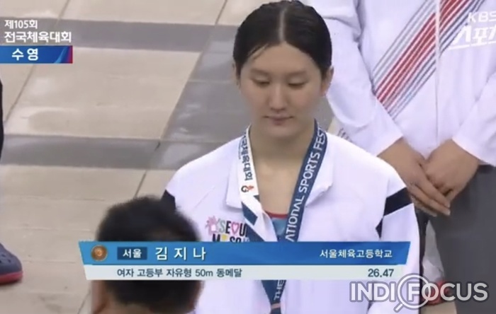 경남 창원에서 열린 제105회 전국체전에서 서울체육고등학교 1학년 김지나가 접영 50m이어 자유형 50m에서도 동메달을 획득했다.