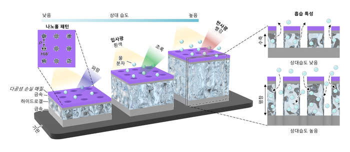 이에 연구팀은 금속-하이드로겔-금속 구조에 손실 매질*을 추가해 다층 파노 공진 구조를 구현하는 것으로 반사 색상을 가산색(加算色, RGB, 빨강-초록-파랑, 색을 섞을수록 밝아짐) 기반 색상으로 변화시켜 센서의 색재현률을 높였으며, 물 분자가 하이드로겔 층과 직접적으로 만날 수 있는 나노 홀 통로를 만듦으로써 반응성을 높였다.