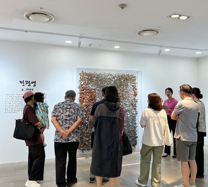 ▲ 우리동네 아트페어가 개최되는 롯데마트 송파점 2층에서 도슨트의 설명을 듣고 있는 관람객들 © 김중건