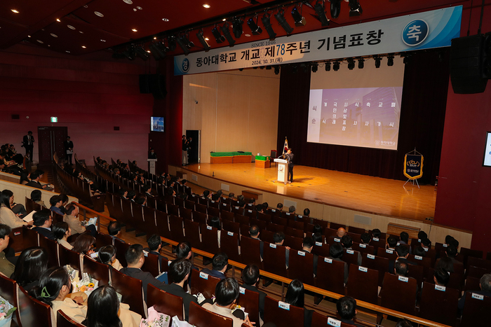 ![]() ▲ 31일 오전 동아대 부민캠퍼스 다우홀에서 열린 ‘개교 78주년 기념표창 행사’. © 김중건 |