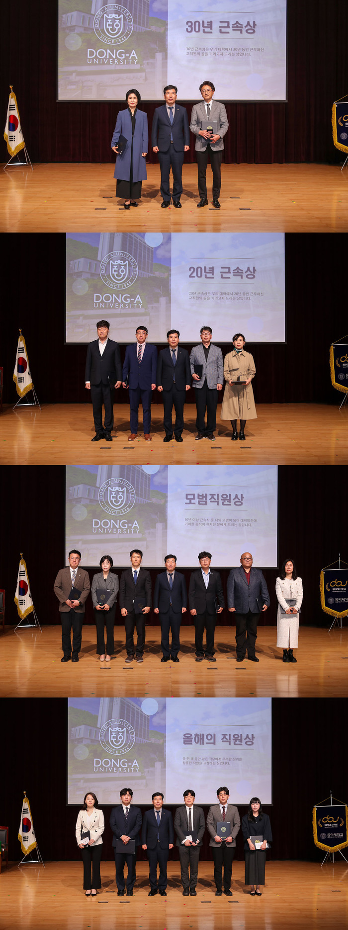 이날 행사에선 ‘자랑스러운 동아인상’과 ‘석당학술상’, ‘공로상’, ‘특별상’, ‘올해의 직원상’, ‘모범직원상’, ‘30년 근속상’, ‘20년 근속상’ 등 부문에서 모두 56명이 표창을 받았다.
