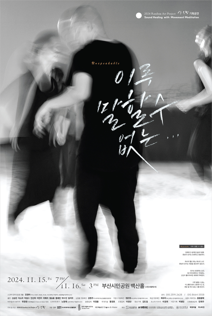 부산대학교(총장 최재원)는 2024 Random Art Project 작은방 기획공연으로 소리·명상·춤이 융합된 「이루 말할 수 없는...」 무대가 15일 오후 7시와 16일 오후 3시 두 차례 부산시민공원 시민사랑채 내 백산홀에서 개최된다고 12일 밝혔다. 전석 무료 초대로, 시민 누구나 관람 가능하다.