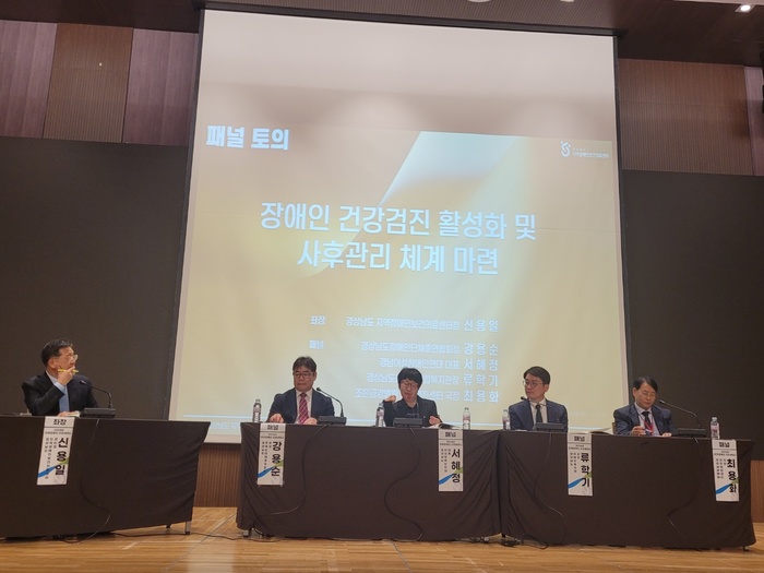 이어 신용일 경상남도 지역장애인보건의료센터장이 좌장을 맡아 ‘장애인 건강검진 활성화 및 건강검진 사후관리 체계 마련’을 주제로 패널 토의를 진행했으며, 패널에는 강용순 경상남도장애인단체총연합회장, 서혜정 경남여성장애인연대 대표, 류학기 경상남도장애인종합복지관장, 최용화 환명의료재단 조은금강병원 건강검진센터 국장이 함께 자리해 토의를 진행했다.