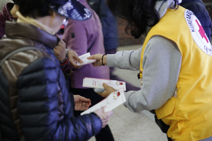 적십자 봉사원들은 치매 예방 수칙 및 운동법이 담긴 리플렛과 돋보기를 부산 시민들에게 배부하며 치매 예방의 중요성을 알렸다.